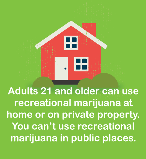 Adults 21 and older can use recreational marijuana at home or on private property. You canāt use recreational marijuana in public places. Public places are places to which the general public has access. This includes, but is not limited to: common areas in apartments and hotels; highways and streets; schools; parks and playgrounds; premises used for public passenger transportation (such …